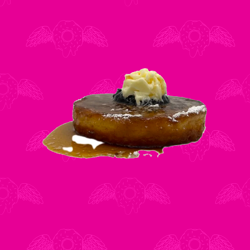 A Fan Favorite, French Toast custard on a Saigon cinnamon and sugar donut, topped with powdered sugar, blueberry jam, whipped butter and 100% Maple Syrup.